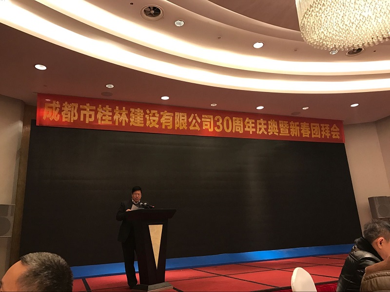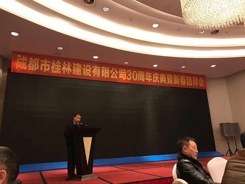 成都市桂林建設有限公司成立三十周年即新春團年大會于2017年元月18日在新都區(qū)假日酒店舉行。會議由管理者代表胡建銘主持。會議在歡快熱烈的氣氛中進行,首選由總經理陳華波作公司工作報告,其次由副總經理陳雪亮作安全生產報告、財務處劉列作財務管理報告。隨后員工代表和與會嘉賓都做了熱情洋溢的發(fā)言,最后董事長陳玉亮代表董事會和公司作了總結報告。隨著歡快的樂曲聲,全體董事和與會員工新春團拜活動開始!
